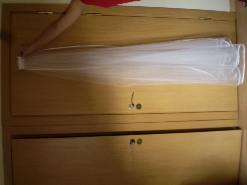 Viena kart devetas ilgas veliumas. Isvalytas ir isgarintas, atrodo kaip naujas! Siutas pagal individulalu uzsakyma. Prisegamas lipduku, galima sventes eigoje nusiimti :) As pati asmeniskai su veliumu buvau oficialioje dalyje veliau ji nusisegiau :) tvirtai prisitvirtina sukutemis, kurias galima lengvai paslepti sukuosenoje :) Prisegimas puostas neriniais, lengvai galima priderinti prie ivairiausio stiliaus suknytes :)