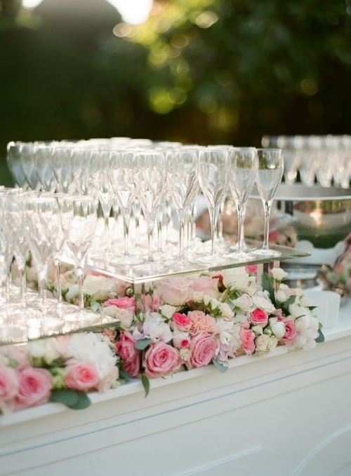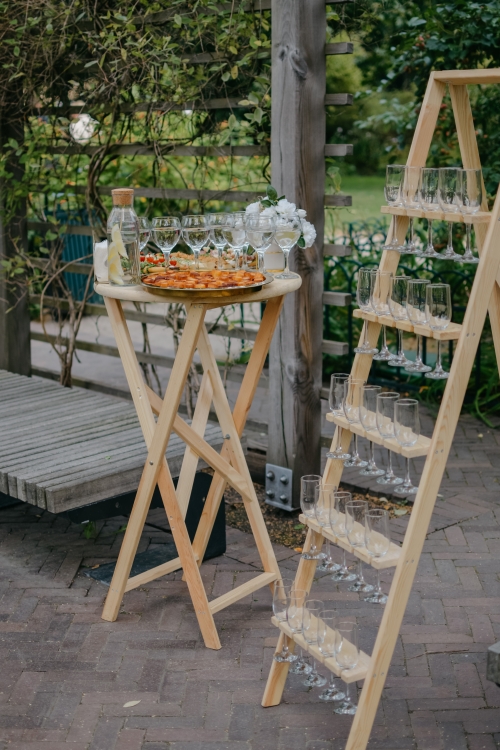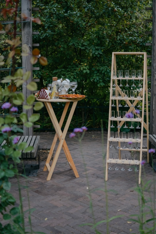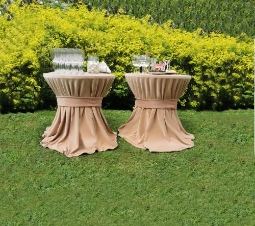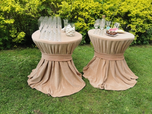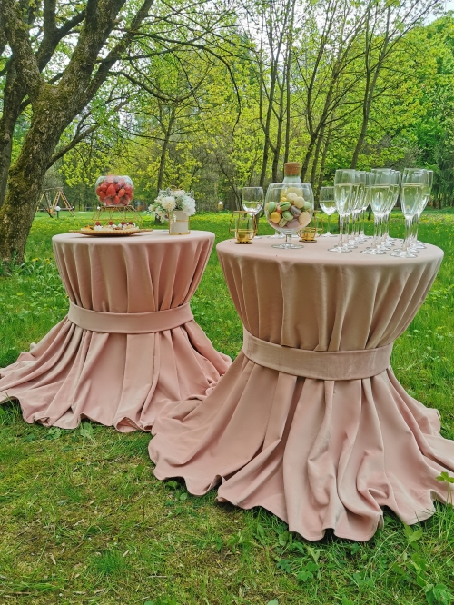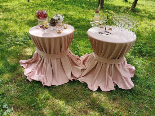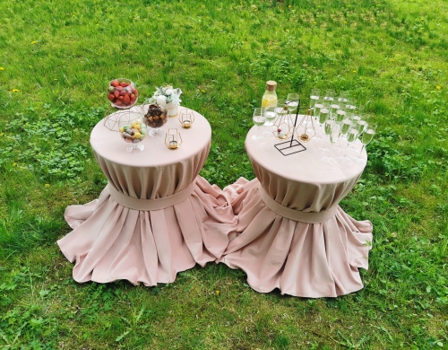 Galime pasiūlyti ne tik klasikinius staliukus apvalius staliukus su baltomis staltiesėmis, dviejų staliukų derinius bet ir išskirtines šampano kopečias su mediniu staliuku.