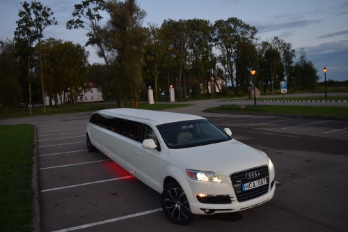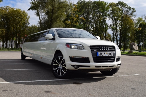 Audi Q7 limuzinas yra puikios techninės būklės ir atvyks pas Jus nepriekaištingai išvalytu salonu bei išore. Pas mus visuomet rasite du šaldytuvus pripildytus ledukų ir atšaldytų gėrimų, barus dekoruotus taurėmis ir servetėlėmis. Limuziną puošiame nemokamai.