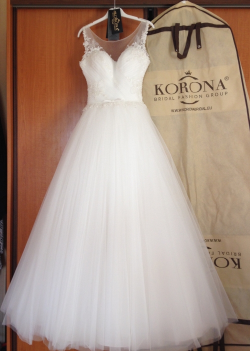 Parduodu vieną kartą dėvėtą vestuvinę suknelę „Korona“ Bridal Fashion Group, M (38-40), pieno baltumo, be šleifo, su gėlėmis, siuviniai, aplikacijos. Audinio sudėtis - atlasas ir organza. Suknelė turi pasijonį, kuris yra prisiūtas prie suknelės, todėl patogu dėvėti. išvalyta, pilnai paruošta dėvėjimui ir laukia naujos šeimininkės. 500 eur.