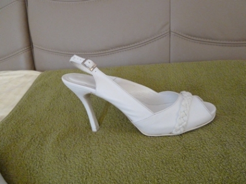 Parduodu siūtus batelius iš baltos natūralios odos su papuošimu iš baltos medžiagos (šilko). Nunešus pas batsiuvį, papuošimą galima nuimti arba pakeisti kitu.